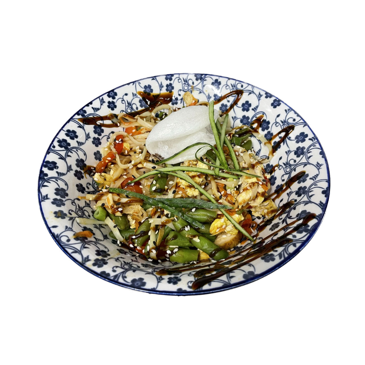 Локшина, квасоля стручкова, перець болгарський, морква, курка, яйце куряче, соус унагі