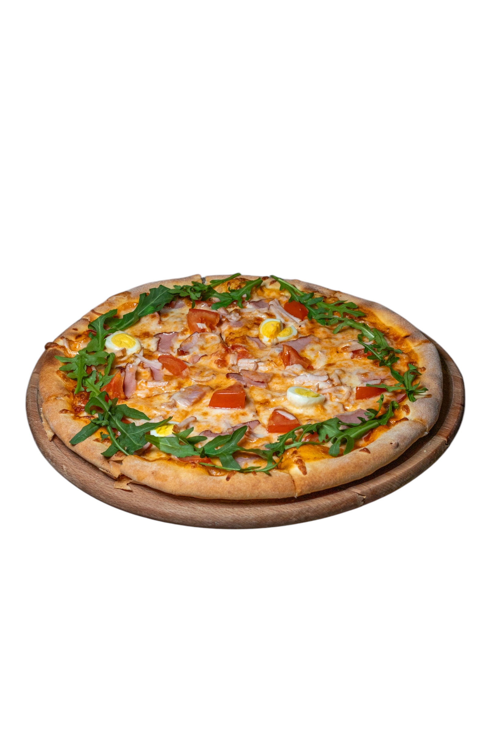 Соус «Цезар», соус «Томатний», сир моцарела, куряче філе, шинка, помідори черрі, яйце перепелине, рукола