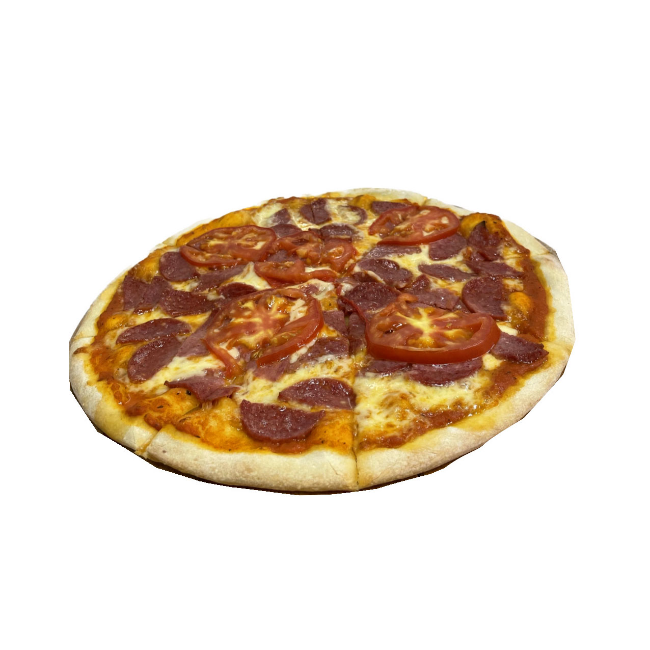 Соус, моцарела, ковбаса салямі, помідори черрі