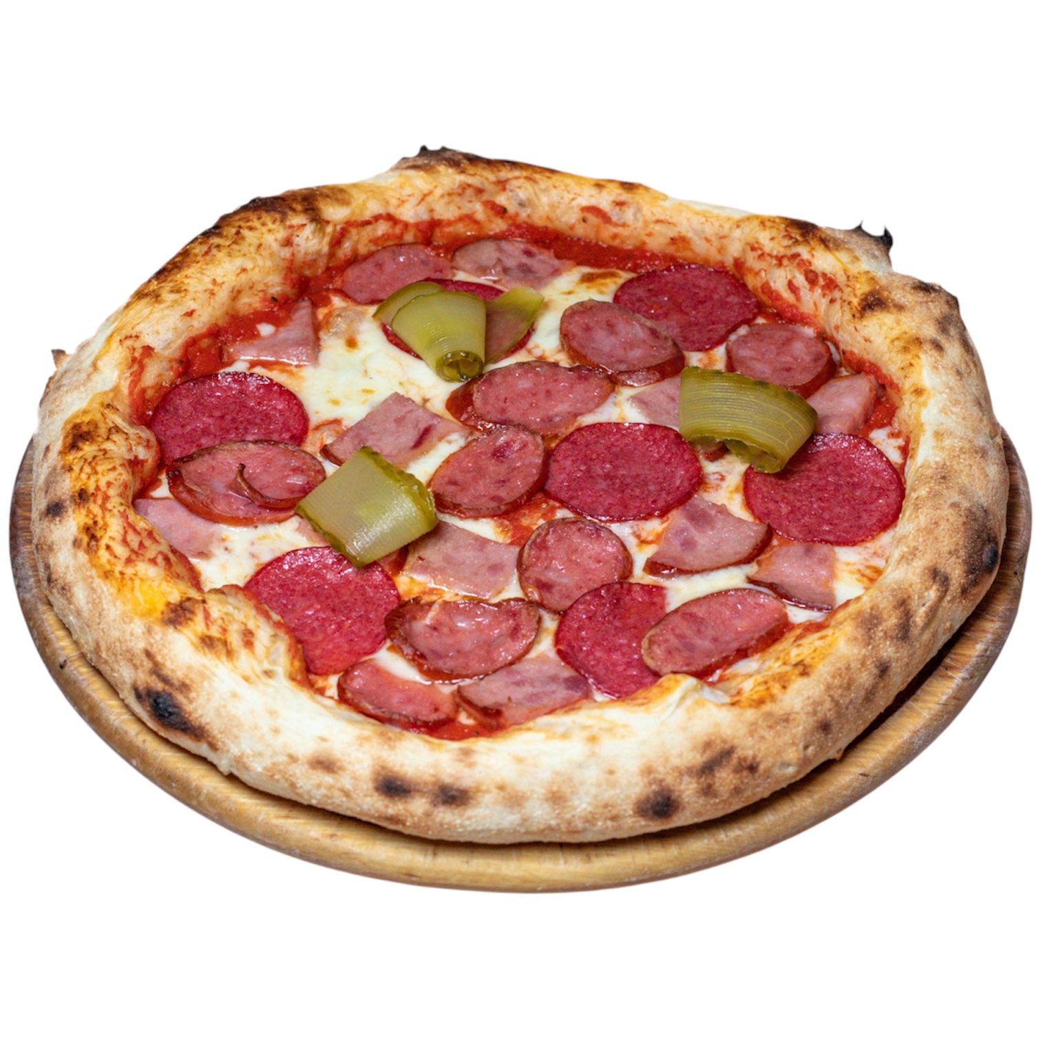 Соус, моцарела, шинка, ковбаса домашня, салямі