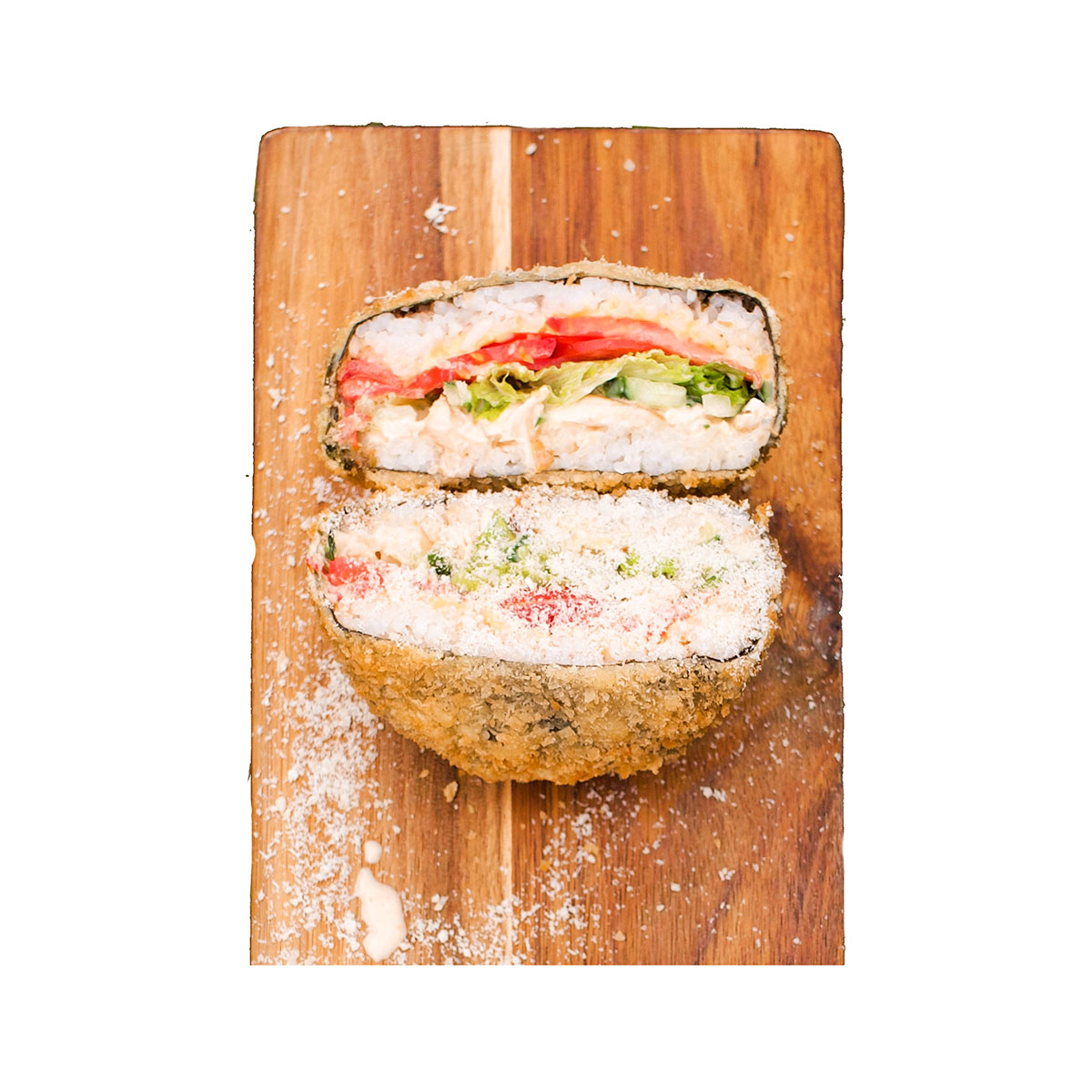 Норі, рис, куряче філе, сир чедер, огірок, листя салату, помідор, соус Цезар, температура-кляр, панко сухарі, пармезан